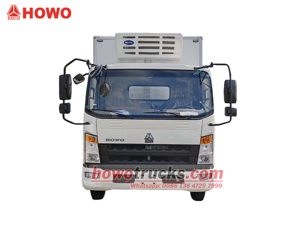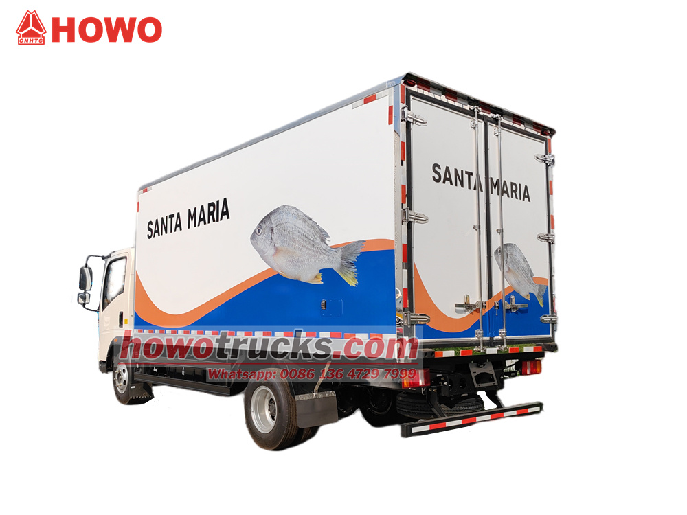HOWO 4x2 sovutgichli yuk mashinasi HOWO yengil yuk mashinasi shassisini, g'ildirak bazasi 3360 mm ni qabul qiladi. Cummins ISF3.8s4R154 154 ot kuchiga ega dvigatel va WLY6TS55 6 pog'onali vites qutisi bilan jihozlangan. Yuqori sovutgichli qutining o'lchami 4200×2200×2050 mm va shisha tolali, FRP + PU ko'pikli + FRP 105 mm panel materialidan tayyorlangan, to'liq yopiq sendvich paneli, o'ng tomondagi eshik, to'liq o'lchamli ikki tomonlama orqa eshik, sirpanmaydigan va aşınmaya bardoshli pol va HX-580 sovutish moslamasidan foydalanadi. Quti 5 tonna yukni tashishi mumkin va asosan dengiz mahsulotlarini sovuq zanjirli tashish uchun ishlatiladi.