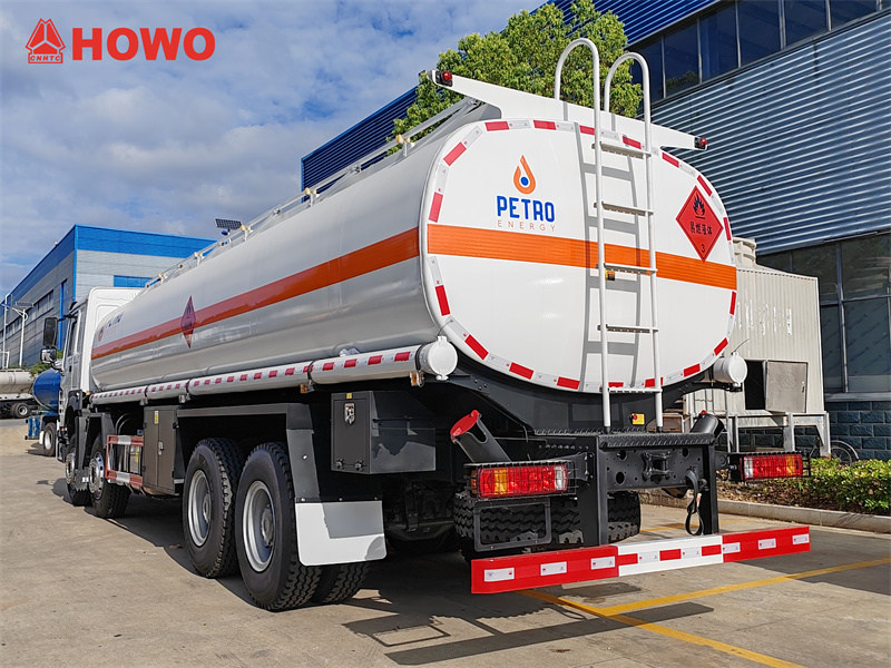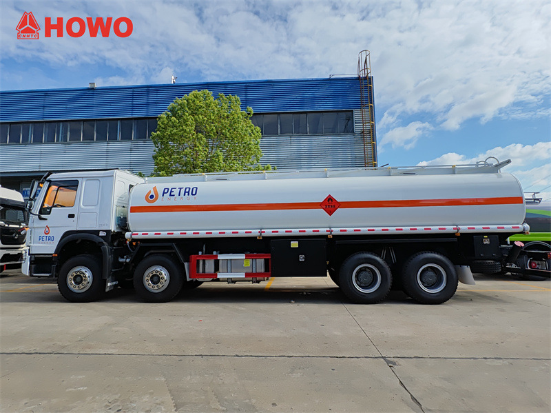 Sinotruk HOWO 8x4 25 CBM neft tanker yuk mashinasi, u Sinotruk HW76 kabinali shassisidan, 8x4 haydovchisidan, 1800+4625+1350 mm g'ildirak bazasidan foydalanadi, Sinotruk WD615.47 dvigateli, HW19710 vites qutisi bilan jihozlangan, yuqori qismi 25 kubometrli uglerod po'latdan yasalgan moy bakidan iborat bo'lib, 6 ta bo'linmaga ega bo'lib, mos ravishda 3, 4, 4, 4, 5, 5 kubometrni sig'dira oladi, ularning har biri Yevropa standartidagi lyuk, pastki klapan, moy tushirish klapani, yuqori yo'lak, tutqich, 1 ta avariya klapani, 2 ta moy tushirish quvurlari bilan jihozlangan.