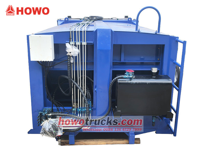 8 kubometrlik axlat tashish mashinalarining kuzovlari yuqori mustahkamlikdagi, korroziyaga chidamli po'lat plitalardan payvandlangan bo'lib, ular mustahkam tuzilishga va kanalizatsiya oqishini va hidning toshib ketishini samarali oldini olish uchun ajoyib muhrlash xususiyatiga ega. Konteynerning ichki qismi axlatni avtomatik ravishda siqish, itarish va tushirish uchun gidravlik moslamadan foydalanadigan itarish plastinkasi va yo'naltiruvchi rels tizimi bilan jihozlangan bo'lib, yuk ko'tarish qobiliyati va tashish samaradorligini sezilarli darajada yaxshilaydi.