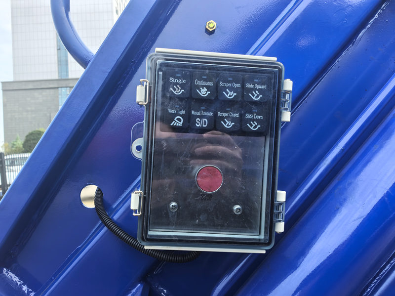 Kabinada boshqaruv bloki itarish va tushirishni boshqarishi va ish rejimini (masalan, avtomatik yoki qo'lda) tanlashi mumkin, transport vositasining orqa qismidagi boshqaruv bloki esa presslash va to'ldirish mexanizmi hamda bochkani burish mexanizmining ishlashini boshqaradi. Foydalanish va boshqarish juda qulay. Ayniqsa, chiqindixonalarda operatorlar transport vositasidan tushmasdan tushirish va oqova suvlarni to'kishni yakunlashlari mumkin. Simli masofadan boshqarish moslamalari foydalanuvchi talablariga muvofiq o'rnatilishi mumkin.