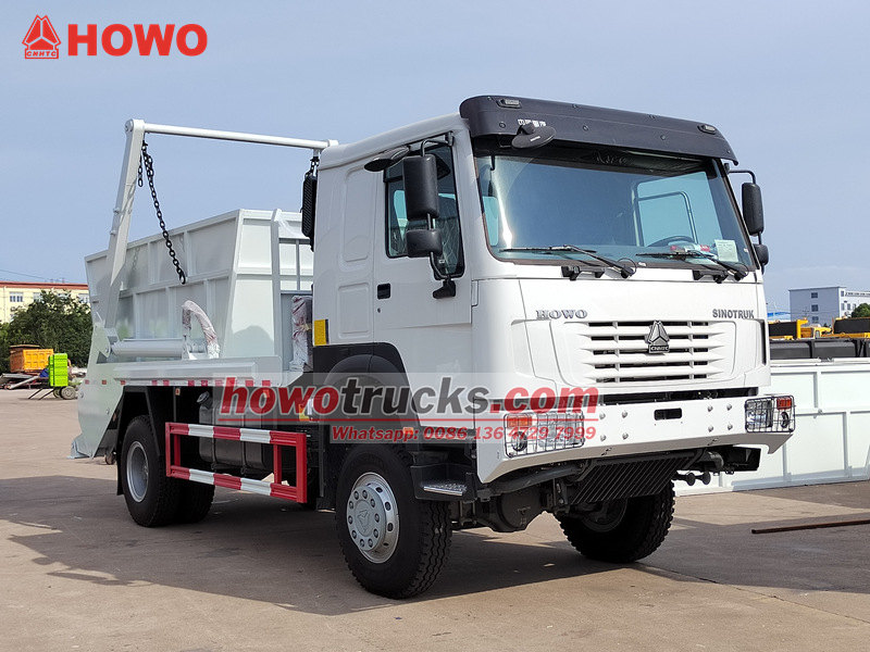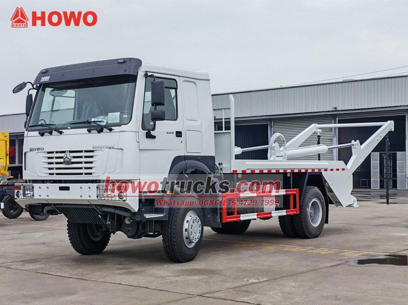 10000HOWO 4×4 Skip Loader Garbage Truck - bu chiqindi konteynerlarini mexanizatsiyalashgan holda yuklash va tushirish uchun aylanuvchi qo'l mexanizmini boshqarish uchun gidravlik tizimdan foydalanadigan ixtisoslashgan sanitariya-gigiena vositasi. U Sinotruk 266 ot kuchiga ega dvigatel bilan jihozlangan HOWO 4×4 to'liq g'ildirakli shassisida qurilgan va HOWO 10 vitesli uzatmalar qutisi va yuqori mustahkamlikdagi o'qlar bilan moslashtirilgan bo'lib, og'ir yuklar va qiyin yo'l sharoitlarida ham kuchli yuk ko'tarish qobiliyati va ishonchliligini ta'minlaydi. Ustki konstruksiya yuqori mustahkamlikdagi po'latdan yasalgan bo'lib, mustahkam va bardoshli ishlashni ta'minlaydi. Asosiy gidravlik aylanuvchi qo'l tizimi uzluksiz va kuchli ishlaydi, ko'tarish quvvati 6 tonnadan oshadi. Har bir ish sikli bir daqiqadan kam vaqtni oladi, bu yuqori samaradorlik va vaqtni tejashni ta'minlaydi.