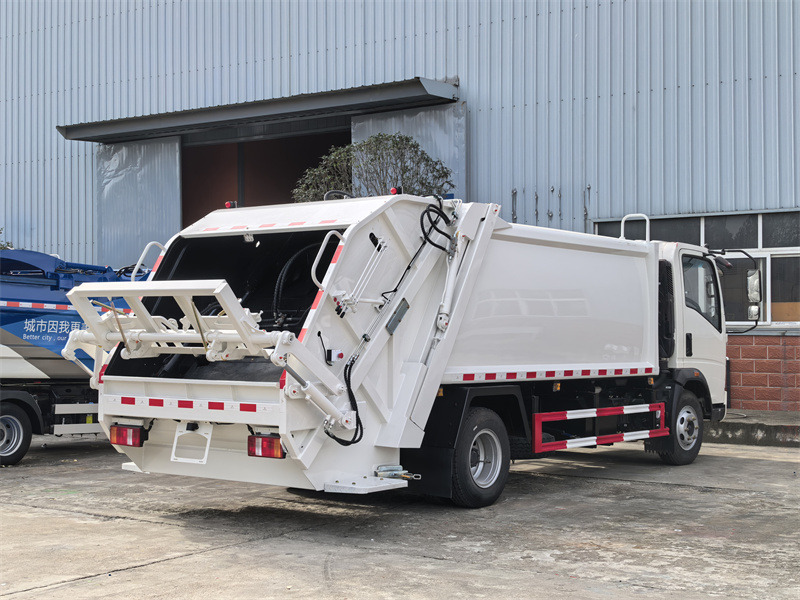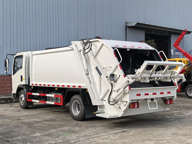 Howo 4x2 8 kubometrli axlat siquvchi yuk mashinasi 3800 mm g'ildirak bazasiga ega Sinotruk Howo yengil yuk mashinasi shassisidan foydalanadi. U Cummins ISF3.8s3141 dvigateli va WLY6TS55 vites qutisi bilan jihozlangan. Yuqori axlat konteyneri yoysimon dizaynga ega, 4 mm qalinlikdagi yon tomonlari va 5 mm qalinlikdagi tagligi bo'lgan uglerod po'latidan yasalgan va korroziya va zangning oldini olish uchun ishlov berilgan. Uning orqa tomoniga o'rnatilgan qiyshaytirgich qutisi mavjud va standart 110L va 240L axlat qutilari bilan jihozlanishi mumkin. CAN-BUS boshqaruv tizimi kabinadagi elektr boshqaruv qutisi, haydovchi tomonidagi gidravlik boshqaruv klapani, orqa eshikning chap tomonidagi elektr boshqaruv qutisi va o'ng tomonidagi qo'lda boshqarish dastagi orqali axlatni yig'ish, siqish va tushirish imkonini beradi.