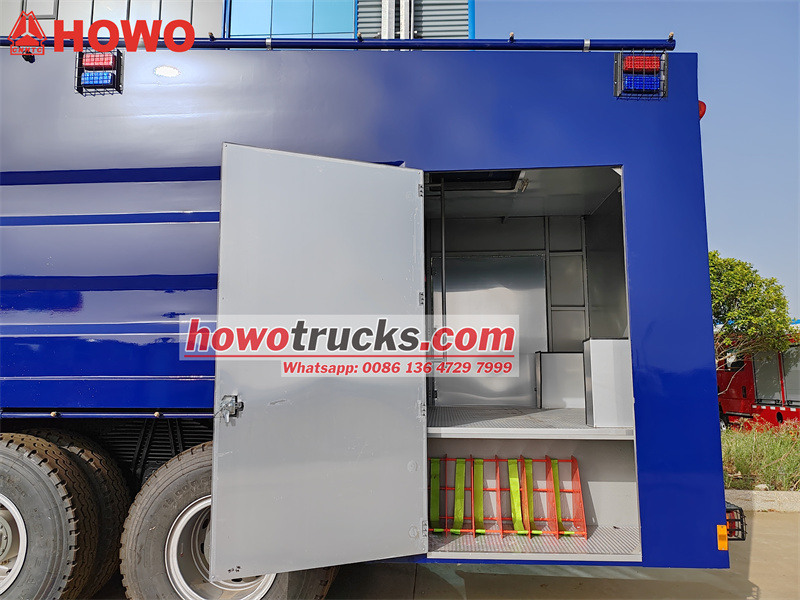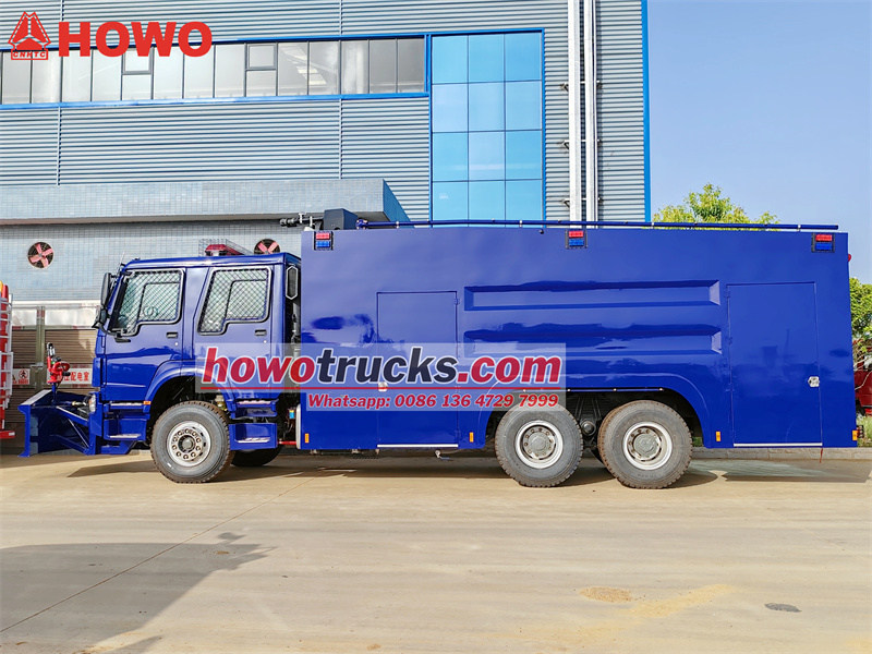 Howo Fire Water Cannon Riot yuk mashinasi 6x4 transmissiyali og'ir Sinotruk shassisidan foydalanadi va 400 ot kuchiga ega WP12S400E201 dvigateli bilan jihozlangan bo'lib, favqulodda operatsiyalar paytida kuchli harakatchanlikni ta'minlaydi. yuk mashinasi Kuzov materiallar, tuzilish va tizimlarda keng qamrovli portlashga chidamli dizaynga ega bo'lib, ekstremal muhitda vazifalarni xavfsiz va samarali bajarishni ta'minlaydi. Haydovchilar profilaktik xavfsizlik choralari va masofaviy hamkorlikdagi operatsiyalarga e'tibor qaratgan holda, ixtisoslashgan haydash ko'nikmalariga va favqulodda vaziyatlarga javob berish qobiliyatlariga ega bo'lishlari kerak.