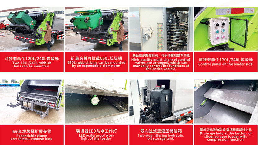 ●Siqish tizimi chiqindilarning osongina to'kilmasligini ta'minlaydi va ikkilamchi ifloslanishni samarali ravishda oldini oladi.